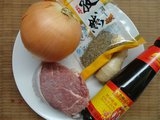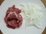 2牛肉垂直肌肉紋理切成0.3cm厚的薄片,加入生抽、生粉、白砂糖、蠔油、油(1茶匙)抓拌均勻腌漬15分鐘。洋蔥去皮洗凈后切成絲。
