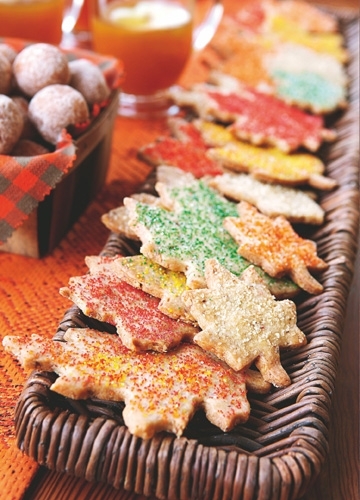 5 在兩層蠟紙之間放上一個壓扁的面團,搟成6毫米厚的面片。拿掉頂部的蠟紙。用5到10厘米長的葉子形狀模具將面片切割成盡可能多的餅干。剩下的邊角料放入冰箱冷藏。餅干擺入準備好的托盤,間距為2.5厘米。