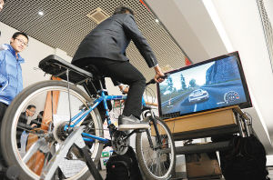 本報(bào)訊 時(shí)下體感游戲最盛行,如果像騎單車一樣駕駛“極品飛車”,在電玩中達(dá)到健身的目的,玩家一定大呼過(guò)癮。昨日,西安電子科技大學(xué)展出兩千余件大學(xué)生科技競(jìng)賽作品,很多創(chuàng)意令人耳目一新。