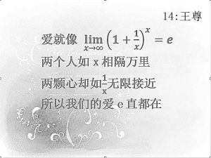 如果你是美劇《生活大爆炸》的粉絲,你一定會明白工科男的可愛之處。而王尊所創作的《愛情公式》,這是用一個標準工科男的思維來闡述愛情的,他是把愛情比作一個大學高數的極限公式,并把公式拆分成地域上的距離和心靈上的距離,最后用我們的愛情e直都在,闡釋了公式的最終結果。