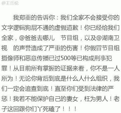 雖然此網(wǎng)友道歉,但是他的言論已經(jīng)傷害到了王詩齡一家人。向來在節(jié)目中性情溫和的王岳倫表示不接受道歉,誓要死磕到底。王岳倫也表示根據(jù)證據(jù)顯示,這個事情并非一人所為,他要揪出其背后的組織。